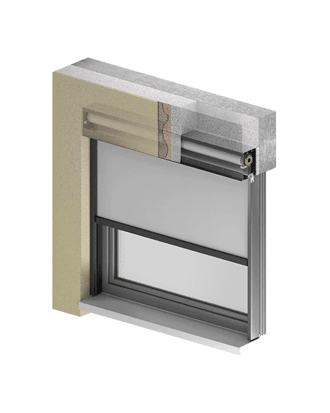 Kassette für Unterputzmontage aus stranggepresstem Aluminium gefertigt und mit einer Leiste versehen, die die Herstellung eines Fassadenvorsprungs ermöglicht.